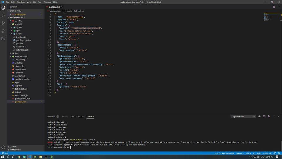 E có tạo một bài tập đầu tiên với RN, nhưng khi chạy bằng cmd của win thì code chạy đc, còn chạy bằng terminal của thằng vscode thì gặp lỗi như hình dù đã chỉnh terminal chạy cmd. Không biết đã có bác nào gặp trường hợp vậy chưa a. Nhưng tiện cho e hỏi lun là code e tải trên github về chỉ cần chạy lên react-native run-android là chạy lun hay phải cấu hình gì lại ko ạ Tks !
