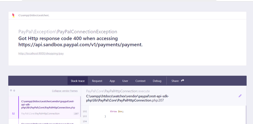 Hiện tại e đang tích hợp paypal vào trong project laravel nhưng khi e gọi API xử lý thì lại ra lỗi như trong hình . Có anh/ chị nào có thể hướng dẫn e cách khắc phục được không ạ ?!