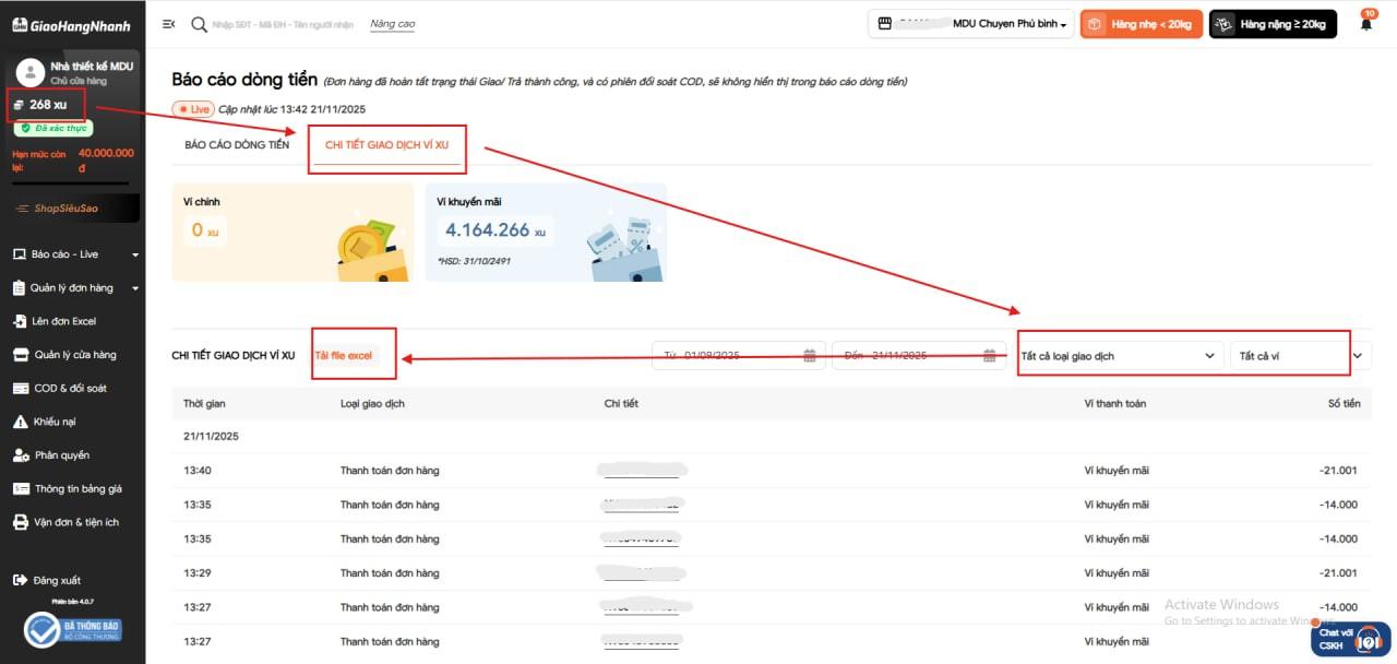 Hiện tại mình cần sử dụng Giao Hàng Nhanh API (GHN API) để lấy dữ liệu giao dịch đối soát ví và giao dịch xu. Nếu tải file excel thủ công thì thao tác như sau: