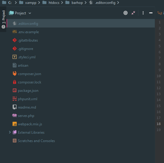 Mở dự án bằng php storm lên thì chỉ hiện như này, phải chuyển sang hiển thị Project Files thì mới hiện đủ file