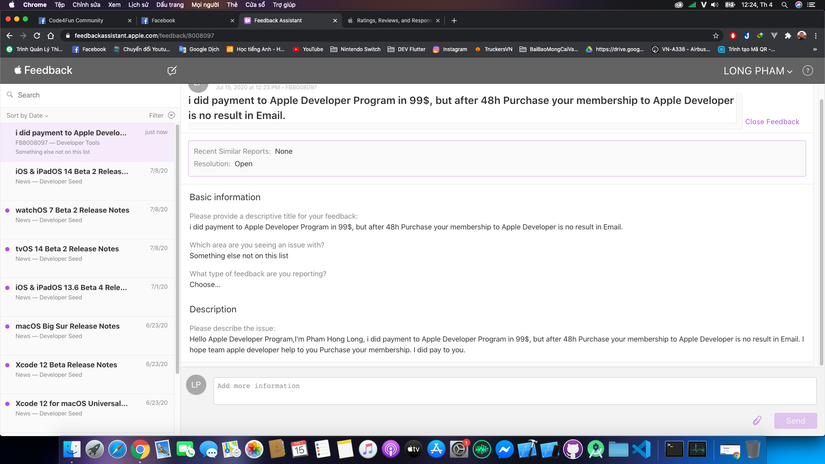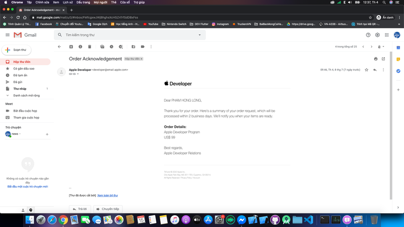 Chào ae,mình hỏi về apple developer xíu,mình mua tài khoản developer 99$ hơn 1 tháng rồi và đến ngày hôm nay mình chưa thấy mail trả về kết quả mua và chưa có thông báo mail mình có ! Mong ae support xin cảm ơn