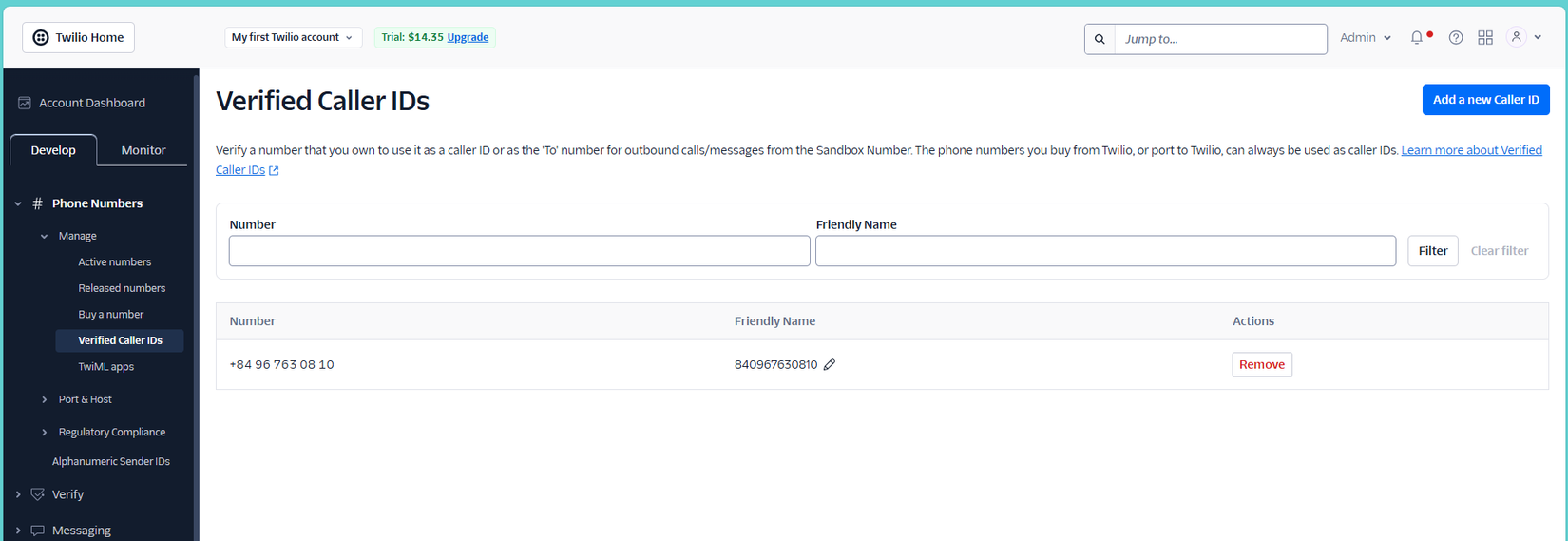 Em đã check lại trên mục Verified Caller IDs thì số của em đã được thêm khi em đăng kí tài khoản: